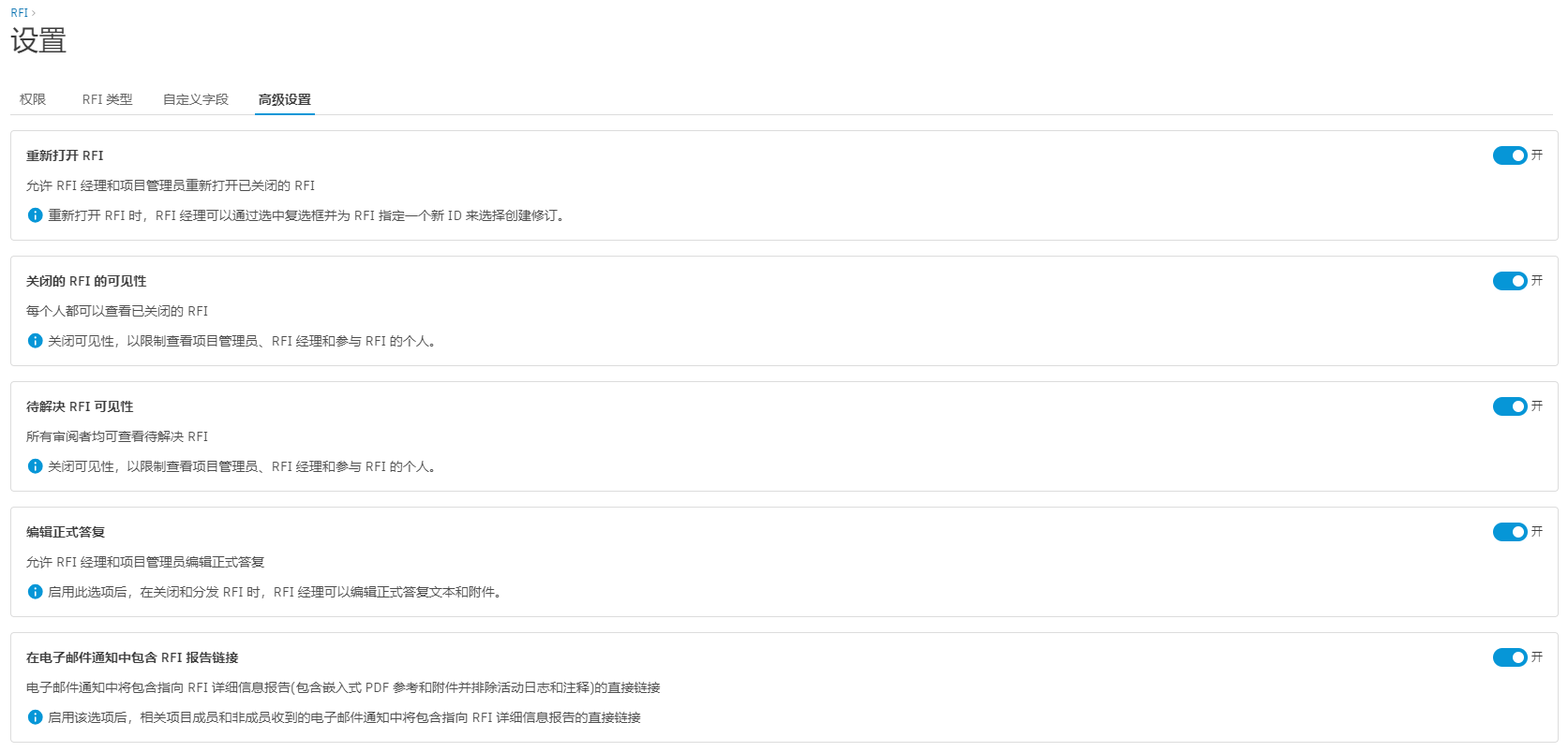高级 RFI 设置允许您控制 RFI 工作流的特定功能。可用设置包括能够: