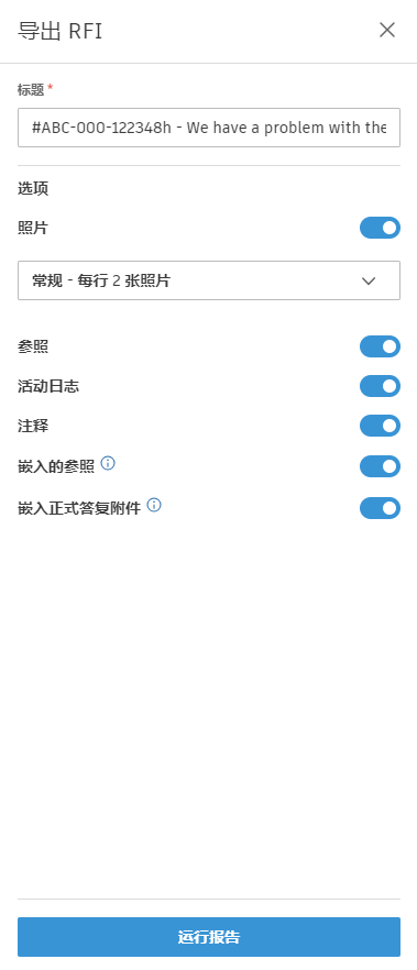 通过导出 RFI,可创建全面的报告,这些报告对于项目来说是至关重要的文档。可以定制这些报告,使其包含 PDF 格式的单个 RFI,或包含 PDF 或 XLSX 格式的所有 RFI。