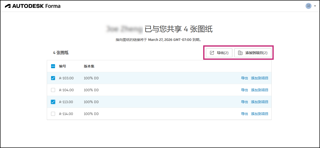 从显示共享图纸的页面将图纸导出或添加到项目的步骤: