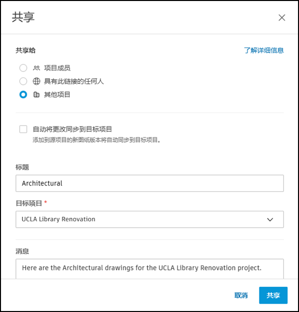 图纸将共享到其他项目。添加图纸后,您将收到一封电子邮件。单击电子邮件中的“查看图纸”以查看其他项目中的图纸。