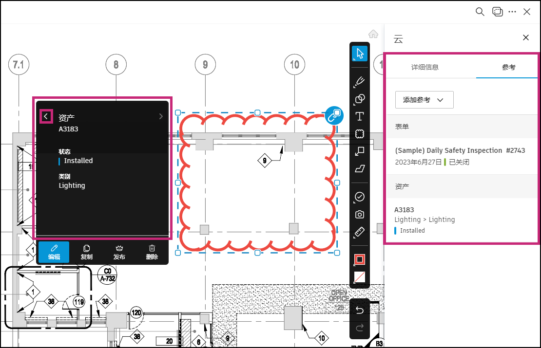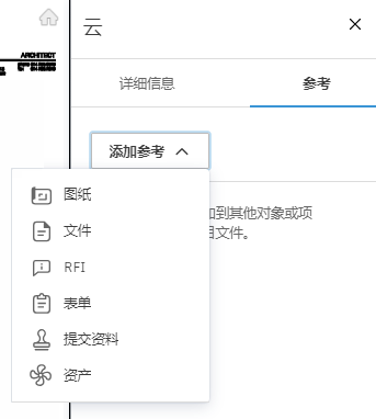 例如,您可以单击标记中对 RFI 的参考。这样将使您在 RFI 工具中定向到该 RFI。单击 RFI 中的标记参考可使您定向回标记所在的文档。
