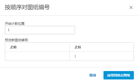 向“开始计数位置”字段中添加一个数字字符,然后在“之后”列中预览所有选定页面的图纸编号。