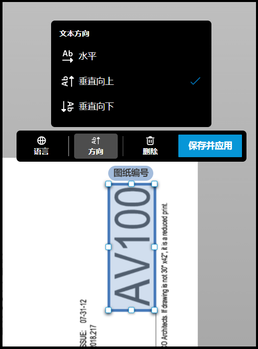 图纸编号可能不是水平的,因此可能无法正确提取。在这种情况下,请单击“方向”以更改 OCR 读取文本方向的方式。在下面的示例中,图纸编号是垂直向上读的: