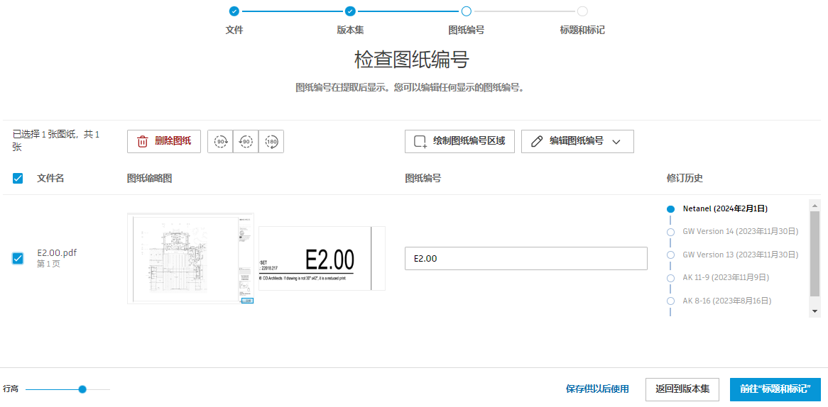 这是图纸发布过程中的第三步,在这一步中,您将检查提取的图纸,并检查和编辑其图纸编号。