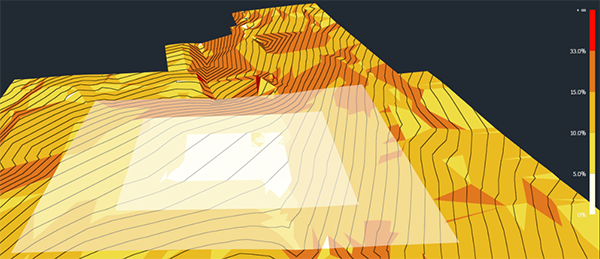 当某个分带被视为放坡边界时,其边界周围的曲面三角形会固定到其原始高程,并且不会在该分带外发生放坡。这样可以缩小要优化的曲面面积,从而有助于缩短优化计算时间。