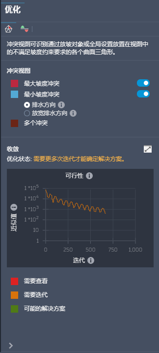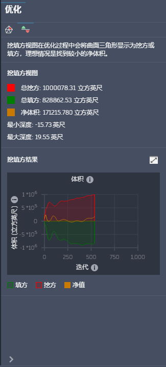 开始后,该面板将显示有关坡度冲突和挖方填方土方进度的更多详细信息。