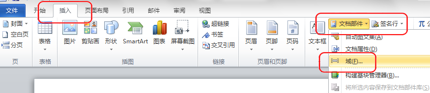 若要插入新 MergeField,请使用“插入”功能区,然后选择“文档部件”和“域”: