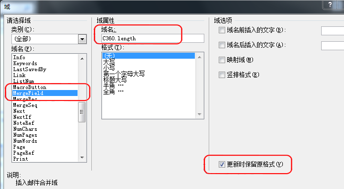 在对话框中,选择“MergeField”,输入“C360.任何内容”作为域名,并保持所有选项不变。尤为重要的是,要确保将“在更新过程中保留格式”复选框设置为选中状态。