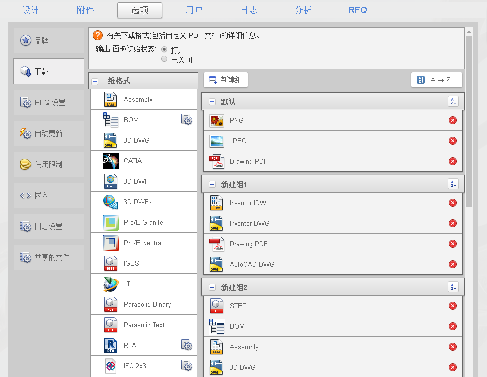 选择“下载”选项中的“打开”或“已关闭”,可以展开或收拢设计中默认输出文件类型的列表。