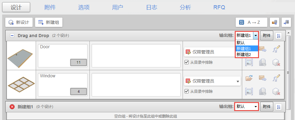 在“设计”页面上,从“输出组”下拉菜单中选择要与每个设计组关联的一组输出文件类型。
