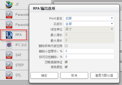- Revit 版本:“旧版”为 Revit 的早期版本,为尚未升级到 Revit 最新版本的 Revit 用户提供兼容性。仅 RFA 输出支持此选项。