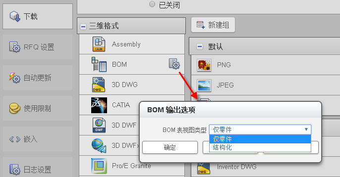 注: 若要控制 DWG (AutoCAD) 或 DXF 输出的选项,您可以随模型文件一起上传一个 OptionsDWG.ini 和/或 OptionsDXF.ini 文件。Configurator 360 在生成相应的格式时会使用此文件。