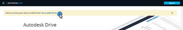 自 2020 年 3 月中旬起,A360 Drive 用户将被重定向到 Autodesk Drive 主页。要访问 A360 Drive,请在 Autodesk Drive 主页顶部依次单击“转到 A360 Drive”、“想要访问 A360 Drive 中的数据?转到 A360 Drive。”