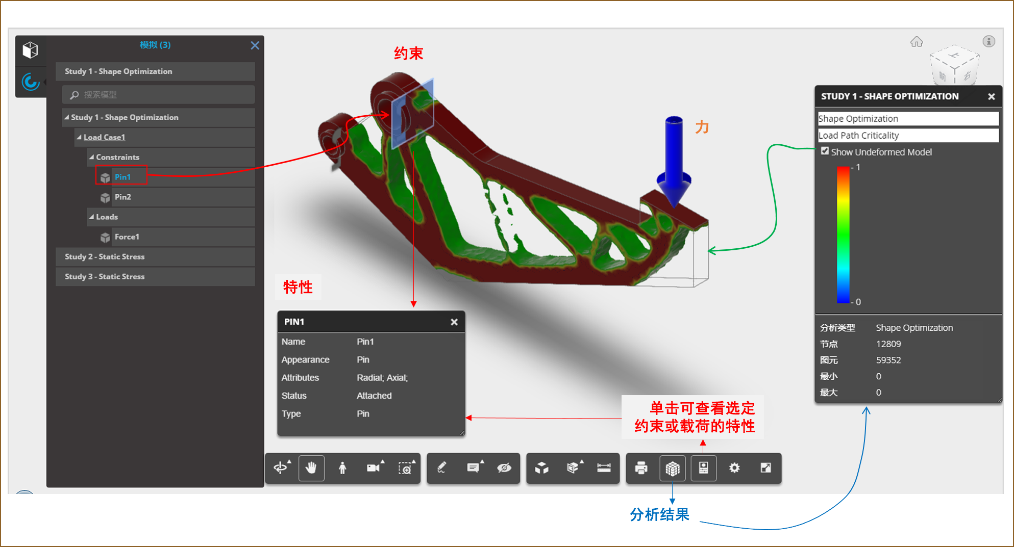 选择载荷或约束,然后单击“查看器”工具栏中的“特性”按钮以查看其特性。