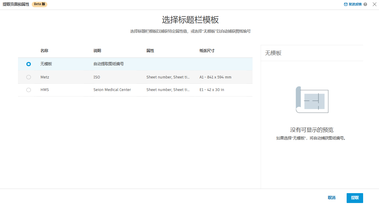 如果项目中有标题栏模板,您将进入提取工作流的第一步,即选择标题栏模板。您可以选择“无模板”或表中列出的由项目管理员创建的标题栏模板。如果没有模板,您将跳过此步骤,并前进到检查和编辑属性。