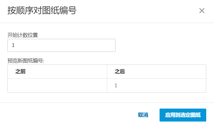 向“开始计数位置”字段中添加一个数字字符,然后在“之后”列中预览所有选定页面的图纸编号。