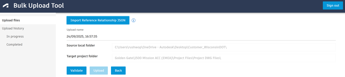 从 DWG Migration and Integrity for Docs 工具导出参考关系 JSON 文件后,您需要将该 JSON 文件导入到批量上传工具。