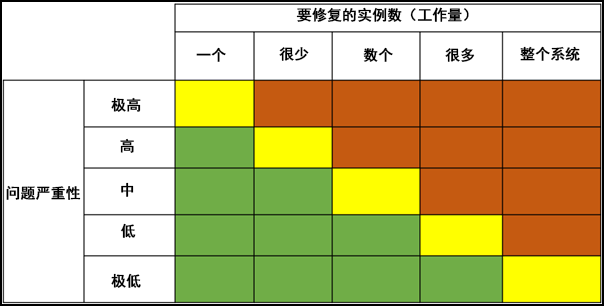 然后,根据问题严重性和所需的工作量,将问题评级为高、中或低: