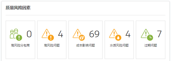 该卡汇总了项目的高风险问题、诸如水问题等特定风险类别以及高风险分包商。它还包含过期问题和核对表活动数据。