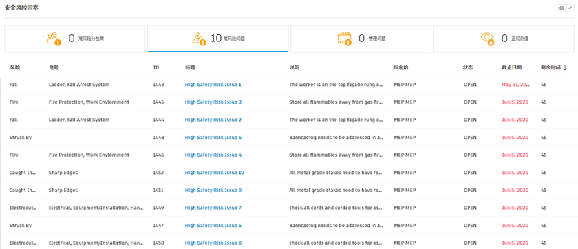 高安全风险问题:按风险类型(包括危险、剩余时间和状态)查看所有高安全风险问题。这是“高安全风险问题”条形图的更详细视图。Construction IQ 会审阅类型为“安全”的所有问题,以预测问题并将其标记为高风险。