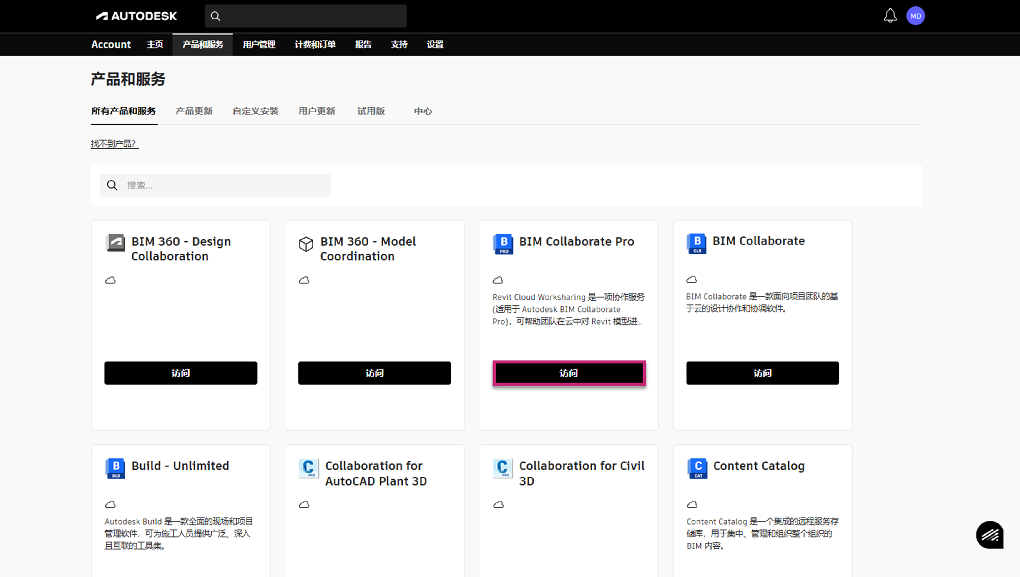 ACC 中的 Account Admin 使您可以从 manage.autodesk.com 查看和使用中心。如果需要将数据存储在多个数据区域中,则需要创建多个中心。可以从 manage.autodesk.com 中的“产品和服务”选项卡创建或访问中心。
