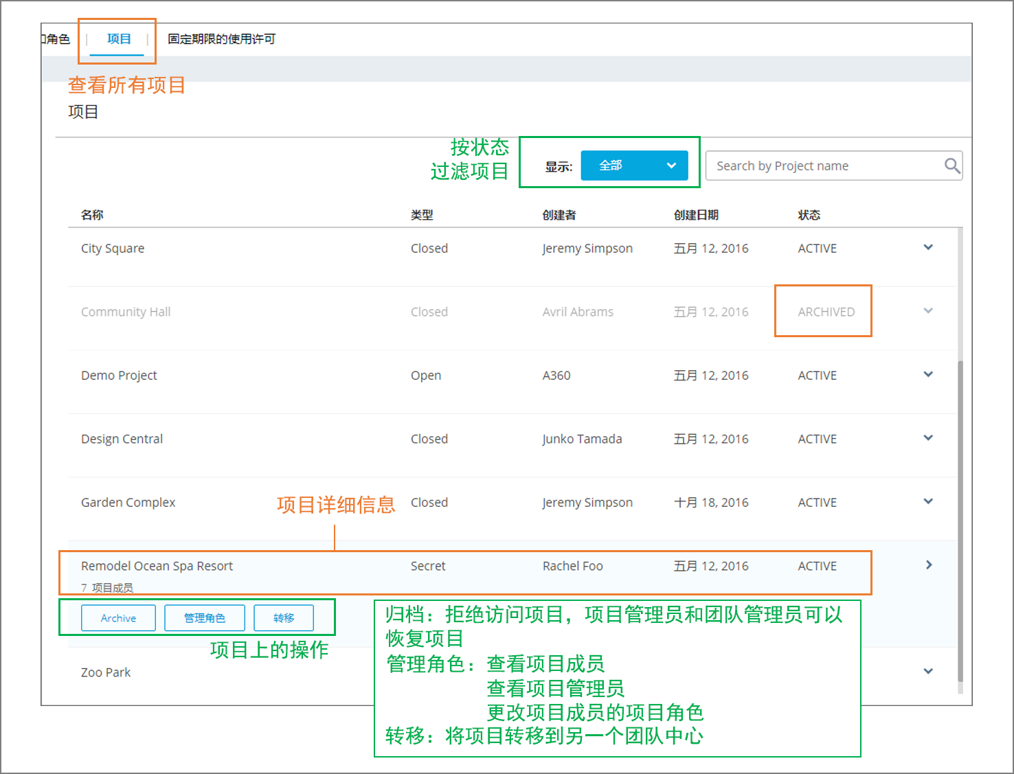 团队管理员可以通过以下方式来管理项目和项目成员。它们可以: