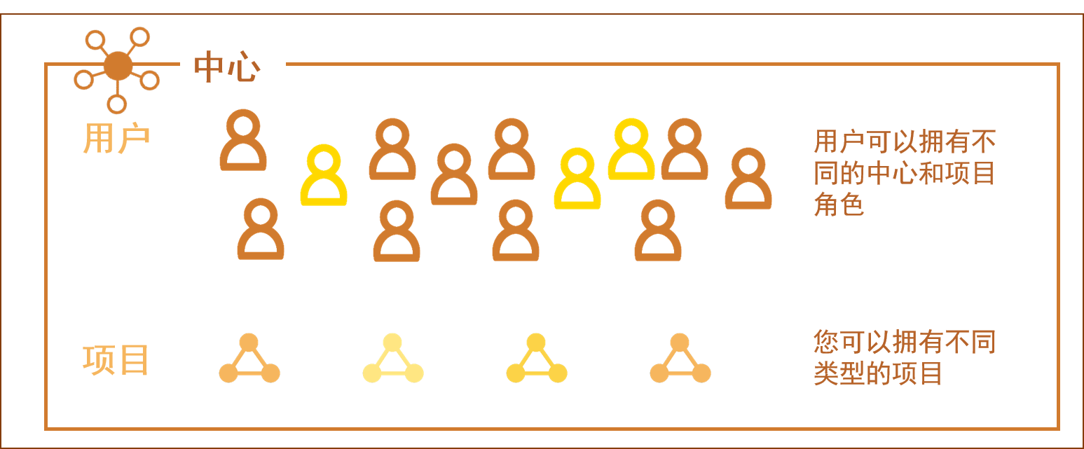 当您注册 Fusion Team 时,可获得某个中心的访问权限。您可以将用户添加到中心并创建项目。所有工作都发生在项目的上下文中。用户可以成为多个项目的成员。用户在中心上具有定义的角色,而在其所属的每个项目中具有不同的角色。