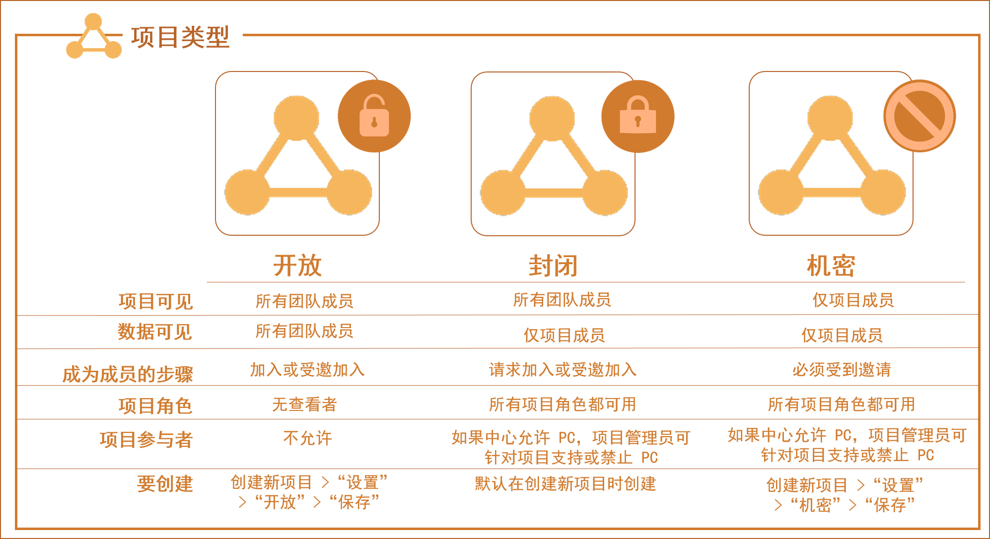 在 Fusion Team 中,可创建 3 种不同类型的项目:开放、封闭和机密。它们在中心可见性、内容隐私和成员资格限制方面的级别各不相同。当创建项目时,该项目默认为“已关闭”项目。如果中心支持 PC,默认还会启用项目参与者访问权限。