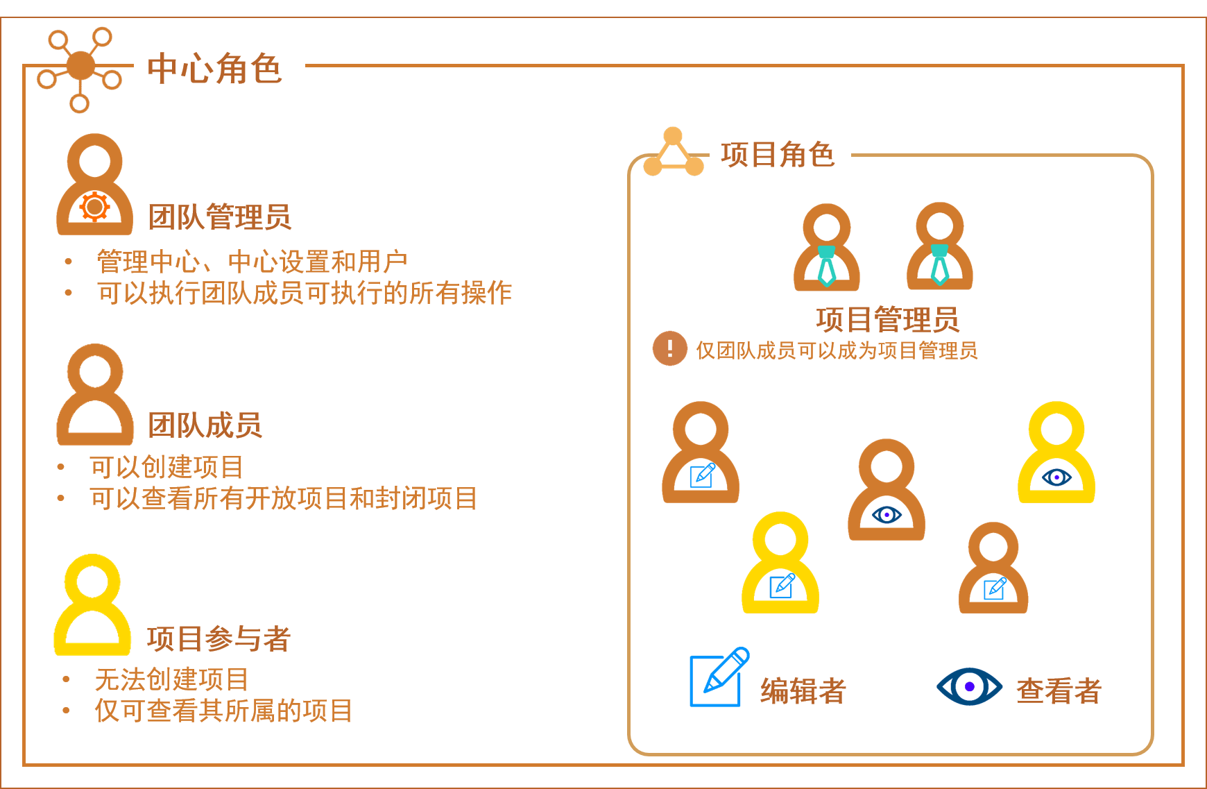 会在中心上和项目内为用户分配不同的角色。用户的中心角色确定他或她在中心上可执行的操作。同样,项目角色确定用户在项目内可执行的操作。