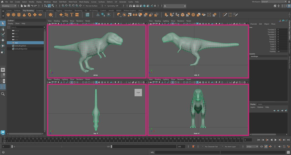 您可以在每个视图面板中拥有不同的摄影机,并逐面板设置不同的显示选项。例如,可在一个视图面板中以着色显示模式使用透视摄影机查看场景,并在另一个视图面板中以线框显示模式使用前正交摄影机查看场景。