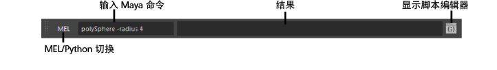 可以在命令行中键入单个 MEL 或 Python 命令,而无需打开脚本编辑器。单击“MEL”/“Python”按钮可在 MEL 和 Python 模式之间切换。命令的结果显示在输出中