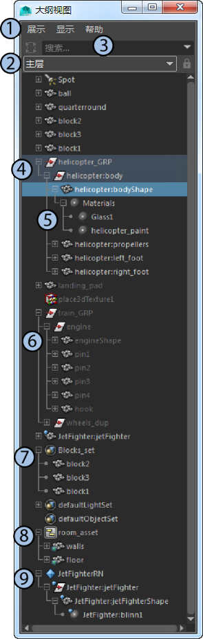 “大纲视图”(Outliner)以大纲形式显示场景中所有对象的层次列表。可以展开和收拢层次中分支的显示;层次的较低级别在较高级别下缩进。它是 Maya Creative 的两个主要场景管理编辑器之一(另一个是 Hypergraph)。