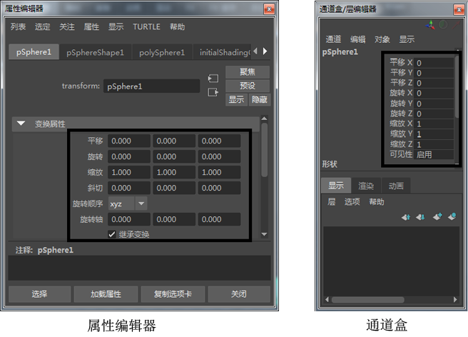 对于为平移、缩放和旋转变换设置特定的 X、Y 和 Z 值,通道盒和属性编辑器都是很有用的。例如,通过将平移值设置为 0, 0, 0,可以将对象快速移动回原点。