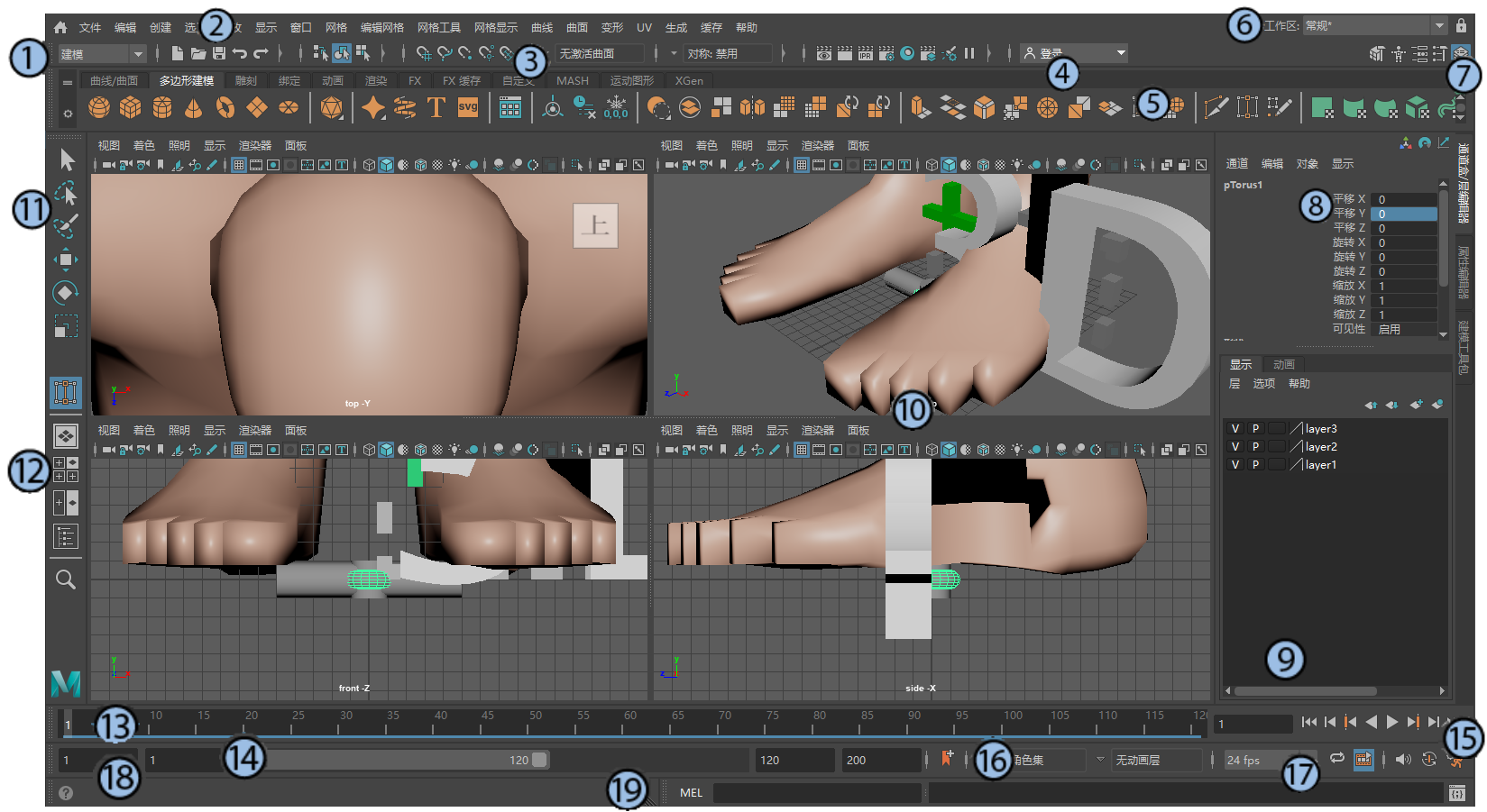 本部分简要概述了 Maya 主界面。以下编号的标题是指图中编号的界面元素。