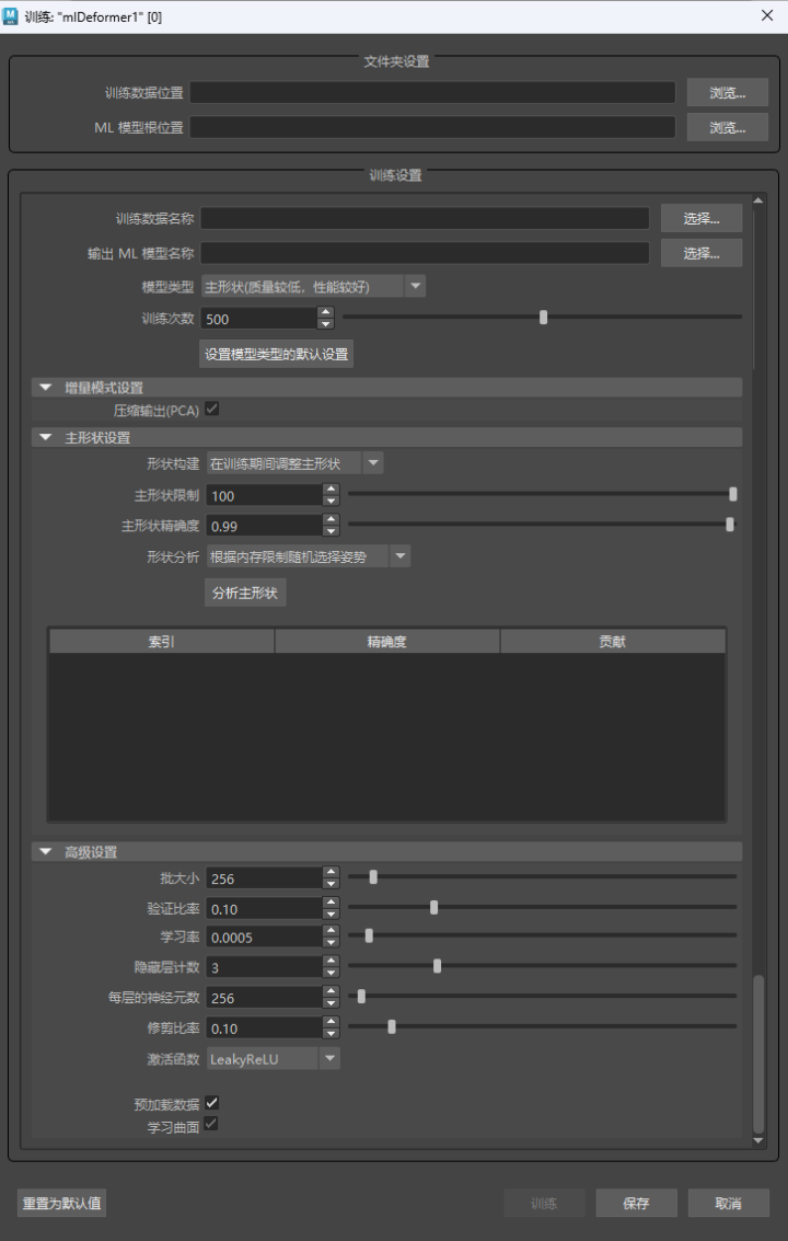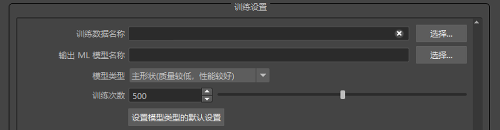 在 ML 变形器训练设置中,您可以配置如何对机器学习模型进行训练数据训练。有关如何导出训练数据的详细信息,请参见 ML 变形器“导出训练数据”(Export Training Data)窗口。