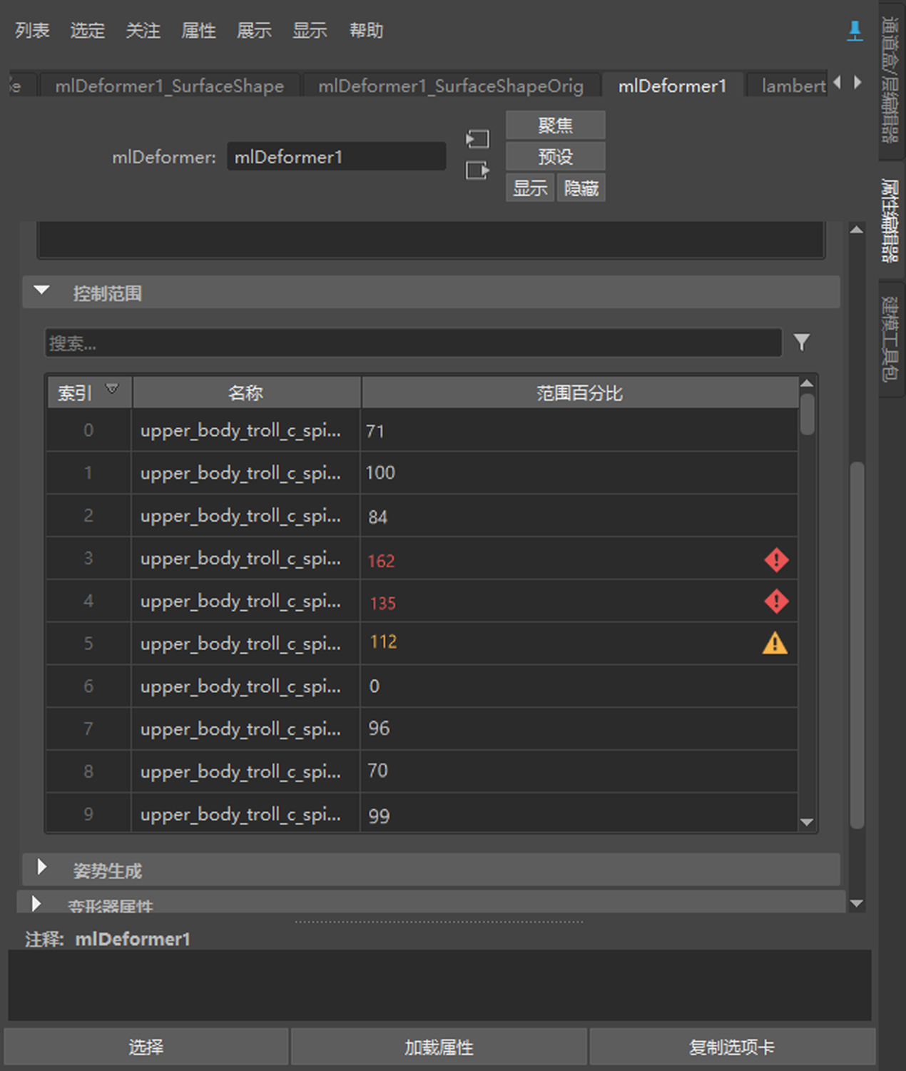 该表将当前控制值与来自所有活动变形管理器的训练范围进行比较。如果控制值超出原始训练范围,则“范围百分比”(Range %)将更改颜色,变形结果可能无法预测。范围为 100% 或更低表示控制值在训练范围内。任何大于 100% 的值都表示控制超出其训练范围,可能会产生较差的结果。如果单个 ML 变形器节点上有多个模型处于活动状态(即,在处理多个几何体时),则该表将在所有模型中使用最严格的范围。