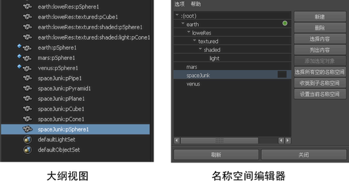 选择对象/节点后,其名称空间将出现在“通道盒”(Channel Box)、“大纲视图”(Outliner)或其他编辑器中。具有指定名称空间的对象的名称如下所示: