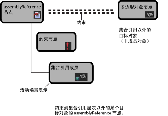 如果顶级 assemblyReference 节点是目标对象或受约束对象,则切换表示时约束行为将保持。例如,如果 assemblyReference 节点被约束为目标对象,则集合表示从“场景表示”(Scene representation)切换为“缓存表示”(Cache representation)时,约束行为不会改变。