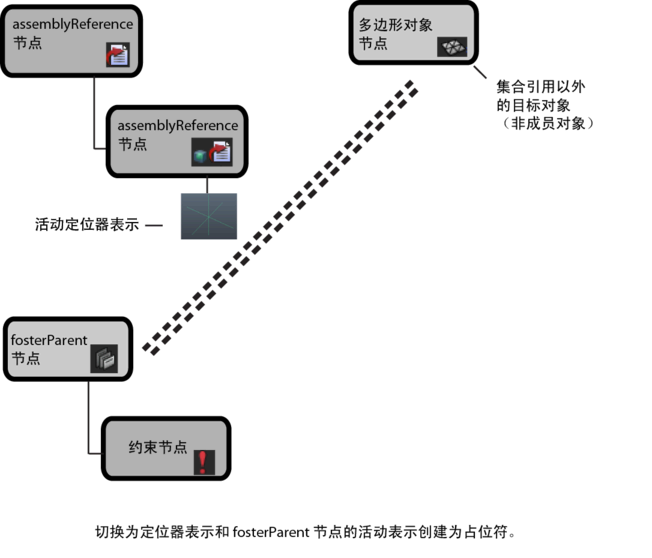 通过此 fosterParent 节点可以维护与约束节点的连接。fosterParent 节点暂时继承来自 assemblyReference 节点的变换值。当重新加载 assemblyReference 节点时,fosterParent 节点将被移除。重新加载 assemblyReference 节点时,不会向其应用对 fosterParent 节点所做的修改。
