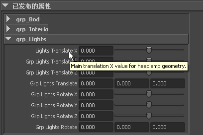 右侧面板中的已发布属性将会更新以反映所做的更改。更改也会反映在其他编辑器中,例如:“属性编辑器”(Attribute Editor)。