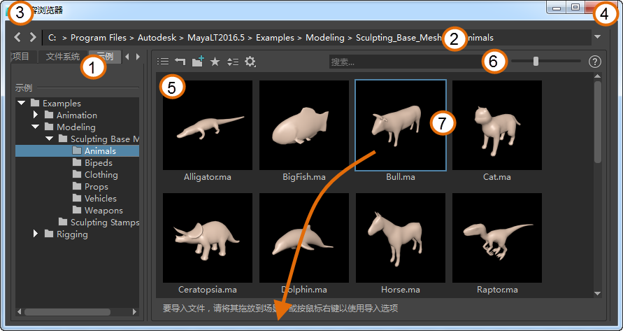 采用不同的方式(例如,通过将文件拖放到视图面板中)将文件导入到场景中。您还可以引用文件的内容。有关详细信息,请参见下文。 |