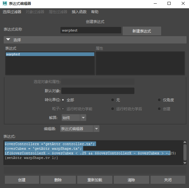 导航到“窗口 > 动画编辑器 > 表达式编辑器”(Window > Animation Editors > Expression Editor)。