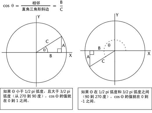 cos 函数与 sin 函数十分类似,除了其返回值是 90 度或 pi/2(反相)以外。