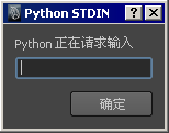 Python 支持从 STDIN(标准输入)进行读取。在 Python 脚本中,这是通过从 sys.stdin 进行读取或调用 raw_input 来实现的。当 Maya 在 GUI 模式(与批处理模式相对)下运行时,Maya 会拦截来自 Python 的调用并通过一个对话框来提示用户在其中键入输入。