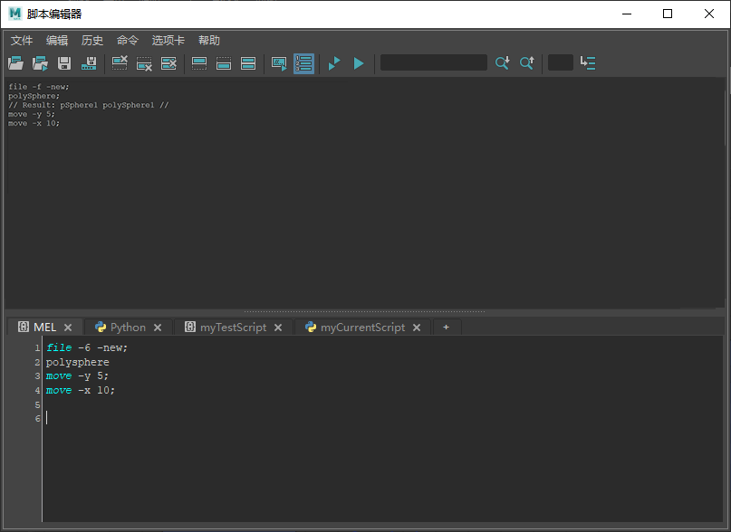 使用“脚本编辑器”(Script Editor)可以键入较长的多行脚本,并可以在历史窗格中查看其输出。