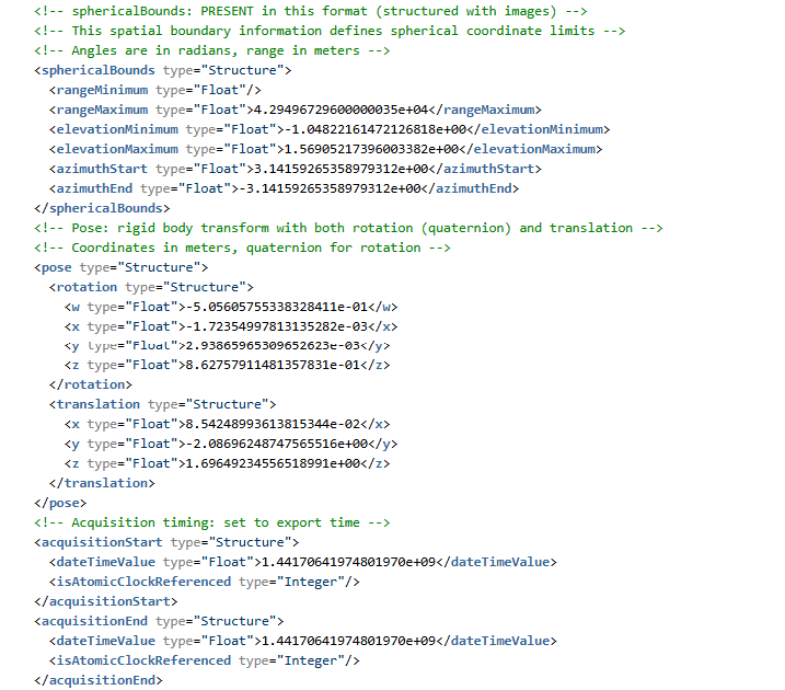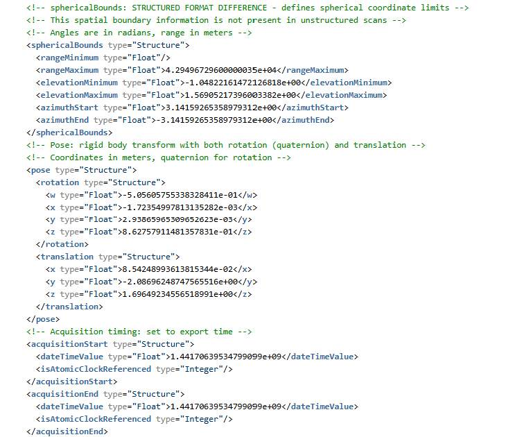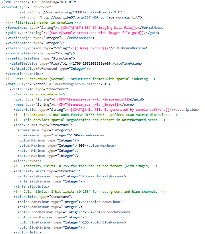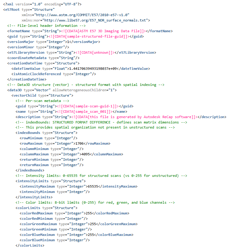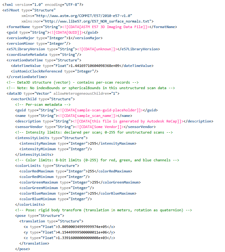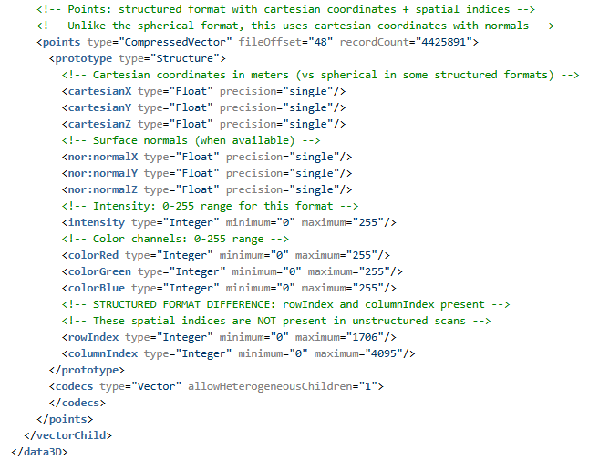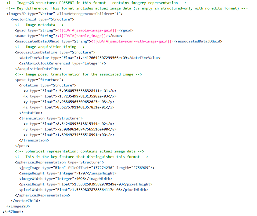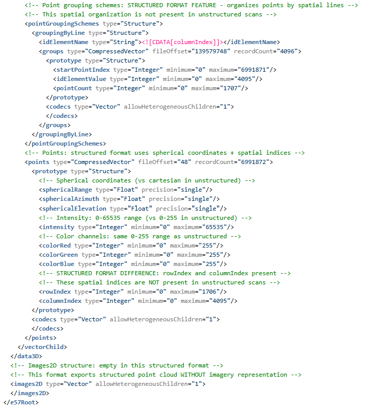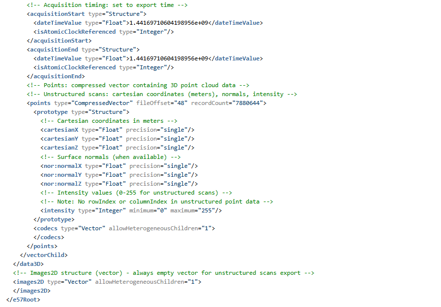 - 根结构:E57 文件根包含名为 data3D(每次扫描记录)和 images2D(可选图像附件)的矢量。这些矢量按扫描/图像填充。