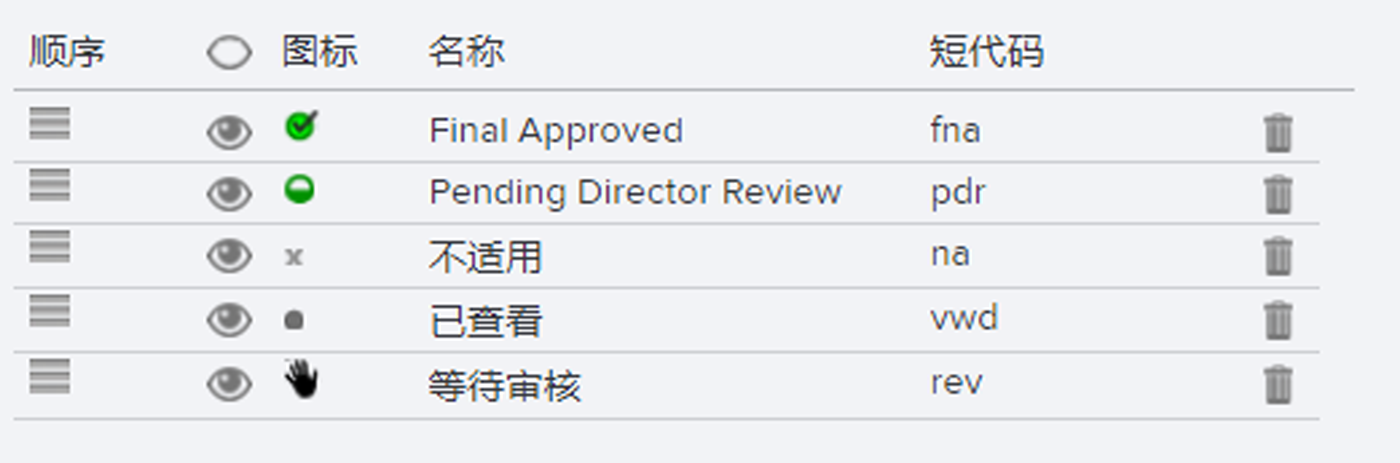 在审核流程中,针对每个版本,这些状态可能会发生变化。列表中的状态顺序应与审核流程一致,以使列表中向下排列的选项指示进度。例如,“等待审核”(Pending Review)在“等待总监审核”(Pending Director Review)之前,而“等待总监审核”(Pending Director Review)在“已最终批准”(Final Approved)之前,依此类推。根据您的审核流程,可能不需要其中一些状态,或者您可能希望添加额外的步骤。