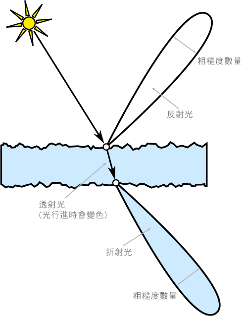 材料內部的光線會以直線行進,但是可能會受到入口和出口表面影響,因為這些表面有可能會像毛玻璃一樣粗糙。