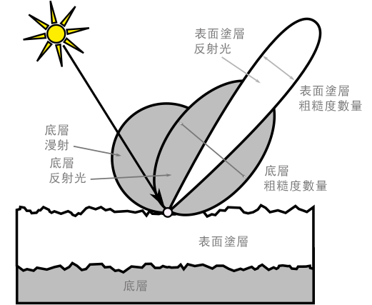 雖然表面塗層會一直存在,但是「權重」會選取底下的漫射 (0.0) 層或金屬 (1.0) 層,或兩者之間的混合。