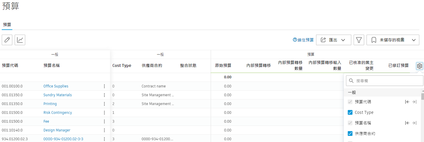 - 對於「合約計價進度表」詳細視圖,如果未選取「將一個預算分配給多個合約」,則欄模式也可以顯示原始預算相關欄。